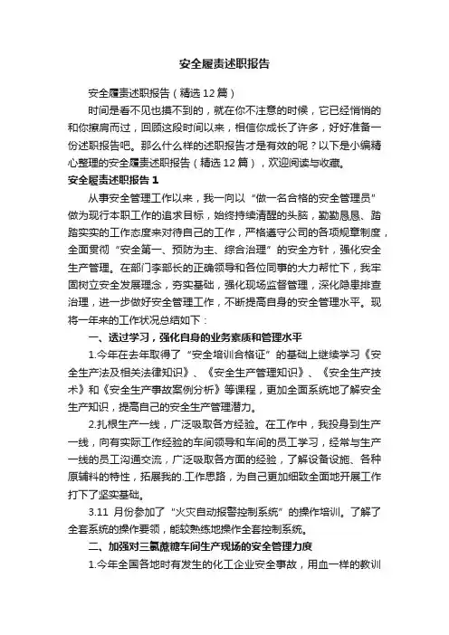 安全生产履职报告范文五篇安全生产履职报告范文一:尊敬的领导:为了全面贯彻落实国家及地方安全生产法律法规,加强我公司的安全生产工作,确保公司生产安全,根据公司安委会的要求,现将我履行安全生产职责的情况进行汇报。