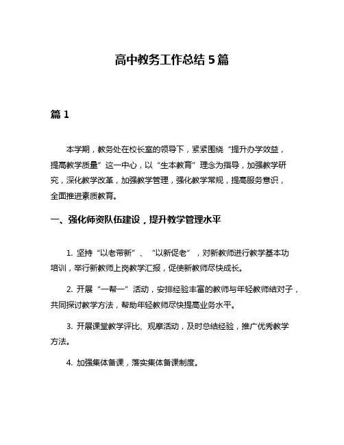 ⾼中学校教务处⼯作总结(通⽤5篇)⾼中学校教务处⼯作总结(通⽤5篇) 不经意间,⼀段时间的⼯作已经结束了,过去这段时间的⾟苦拼搏,⼀定让你在⼯作中有了更多的提升!制定⼀份⼯作总结吧。