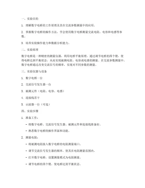三、实验仪器与设备1. 数字电桥一台2. 交流信号发生器一台3. 被测元件(电阻、电容、电感)4. 连接线若干5. 示波器一台(可选)四、实验步骤1. 准备工作:- 将数字电桥、交流信号发生器、被测元件和连接线准备好。