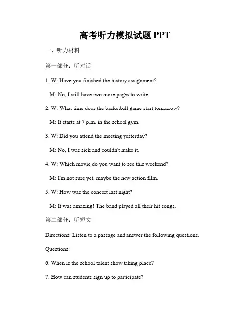 高考听力模拟试题PPT一、听力材料第一部分:听对话1. W: Have you finished the history assignment?M: No, I still have two more pages to write.2. W: What time does the basketball game start tomorrow?M: It starts at 7 p.m. in the school gym.3. W: Did you attend the meeting yesterday?M: No, I was sick and couldn't make it.4. W: Which movie do you want to see this weekend?M: I'm not sure yet, maybe the new action film.5. W: How was the concert last night?M: It was amazing! The band played all their hit songs.第二部分:听短文Directions: Listen to a passage and answer the following questions. Questions:6. When is the school talent show taking place?7. How can students sign up to participate?8. What is the main purpose of the talent show?二、听力练习第一部分:听对话1. Where does the conversation take place?A. At a restaurant.B. At a library.C. At a gym.2. What does the man still need to do?A. Finish his math homework.B. Write two more pages for the history assignment.C. Study for the science test.3. What is the woman asking about?A. Homework due dates.B. Basketball game schedule.C. Meeting location.4. When does the basketball game start?A. At 6 p.m.B. At 7 p.m.C. At 8 p.m.5. What movie does the man want to see?A. The new action film.B. A romantic comedy.C. A documentary film.第二部分:听短文6. What is the main event mentioned in the passage?A. School prom.B. School talent show.C. School dance.7. How can students participate in the talent show?A. Sign up online.B. Talk to the school principal.C. Fill out a form in the school office.8. Why is the talent show being held?A. To raise money for charity.B. To showcase students' talents.C. To promote school spirit.三、听力答案1. B2. B3. A4. B5. A6. B7. C8. B以上是本次高考听力模拟试题PPT的内容,希望能够帮助大家更好地准备听力考试。