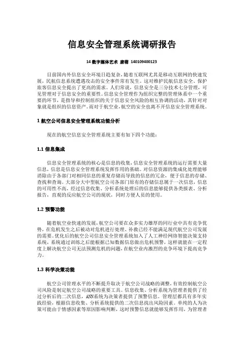信息安全管理系统调研报告14数字媒体艺术唐萌140109400123目前国内外信息安全环境日趋复杂,随着互联网尤其是移动互联网的快速发展,民航信息系统遭遇攻击的安全事件常有发生。