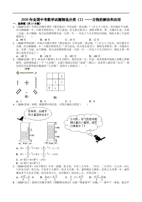 2020年全国中考数学试题精选分类(2)——方程的解法和应用一.选择题(共23小题)1.(2020•东营)中国古代数学著作《算法统宗》中有这样一段记载:“三百七十八里关,初日健步不为难,次日脚痛减一半,六朝才得到其关.”其大意是:有人要去某关口,路程378里,第一天健步行走,从第二天起,由于脚痛,每天走的路程都为前一天的一半,一共走了六天才到达目的地.则此人第三天走的路程为()A.96里B.48里C.24里D.12里2.(2020•呼和浩特)中国古代数学著作《算法统宗》中有这样一段记载,“三百七十八里关;初日健步不为难,次日脚痛减一半,六朝才得到其关.”其大意是;有人要去某关口,路程为378里,第一天健步行走,从第二天起,由于脚痛,每天走的路程都为前一天的一半,一共走了六天才到关口,则此人第一和第六这两天共走了()A.102里B.126里C.192里D.198里3.(2020•盐城)把1~9这9个数填入3×3方格中,使其任意一行,任意一列及两条对角线上的数之和都相等,这样便构成了一个“九宫格”.它源于我国古代的“洛書”(图①),是世界上最早的“幻方”.图②是仅可以看到部分数值的“九宫格”,则其中x的值为()A.1 B.3 C.4 D.64.(2020•青海)如图,根据图中的信息,可得正确的方程是()A.π×()2x=π×()2×(x﹣5)B.π×()2x=π×()2×(x+5)C.π×82x=π×62×(x+5)D.π×82x=π×62×55.(2020•张家界)《孙子算经》中有一道题,原文是:今有三人共车,二车空;二人共车,九人步,问人与车各几何?译文为:今有若干人乘车,每3人共乘一车,最终剩余2辆车;若每2人共乘一车,最终剩余9个人无车可乘,问共有多少人,多少辆车?设共有x人,可列方程()A.﹣9 B.+2=C.﹣2=D.+96.(2020•内江)我国古代数学著作《增删算法统宗》记载“绳索量竿”问题:“一条竿子一条索,索比竿子长一托.折回索子却量竿,却比竿子短一托.”其大意为:现有一根竿和一条绳索,用绳索去量竿,绳索比竿长5尺;如果将绳索对半折后再去量竿,就比竿短5尺.设绳索长x尺.则符合题意的方程是()A.x=(x﹣5)﹣5 B.x=(x+5)+5C.2x=(x﹣5)﹣5 D.2x=(x+5)+57.(2020•锦州)某校计划购买篮球和排球共100个,其中篮球每个110元,排球每个80元.若购买篮球和排球共花费9200元,该校购买篮球和排球各多少个?设购买篮球x个,购买排球y个,根据题意列出方程组正确的是()A.B.C.D.8.(2020•绵阳)《九章算术》中记载“今有共买羊,人出五,不足四十五;人出七,不足三,问人数、羊价各几何?”其大意是:今有人合伙买羊,若每人出5钱,还差45钱;若每人出7钱,还差3钱,问合伙人数、羊价各是多少?此问题中羊价为()A.160钱B.155钱C.150钱D.145钱9.(2020•恩施州)我国古代数学著作《九章算术》“盈不足”一章中记载:“今有大器五小器一容三斛,大器一小器五容二斛,问大小器各容几何”.意思是:有大小两种盛酒的桶,已知5个大桶加上1个小桶可以盛酒3斛,1个大桶加上5个小桶可以盛酒2斛.问1个大桶、1个小桶分别可以盛酒多少斛?设1个大桶盛酒x斛,1个小桶盛酒y斛,下列方程组正确的是()A.B.C.D.10.(2020•临沂)《孙子算经》是中国古代重要的数学著作,成书大约在一千五百年前,其中一道题,原文是:“今三人共车,两车空;二人共车,九人步.问人与车各几何?”意思是:现有若干人和车,若每辆车乘坐3人,则空余两辆车;若每辆车乘坐2人,则有9人步行.问人与车各多少?设有x人,y辆车,可列方程组为()A.B.C.D.11.(2020•绥化)“十•一”国庆期间,学校组织466名八年级学生参加社会实践活动,现已准备了49座和37座两种客车共10辆,刚好坐满,设49座客车x辆,37座客车y辆.根据题意,得()A.B.C.D.12.(2020•绍兴)同型号的甲、乙两辆车加满气体燃料后均可行驶210km,它们各自单独行驶并返回的最远距离是105km.现在它们都从A地出发,行驶途中停下来从甲车的气体燃料桶抽一些气体燃料注入乙车的气体燃料桶,然后甲车再行驶返回A地,而乙车继续行驶,到B地后再行驶返回A地.则B地最远可距离A地()A.120km B.140km C.160km D.180km13.(2020•桂林)参加足球联赛的每两支球队之间都要进行两场比赛,共要比赛110场,设参加比赛的球队有x支,根据题意,下面列出的方程正确的是()A.x(x+1)=110 B.x(x﹣1)=110C.x(x+1)=110 D.x(x﹣1)=11014.(2020•雅安)如果关于x的一元二次方程kx2﹣3x+1=0有两个实数根,那么k的取值范围是()A.k B.k且k≠0 C.k且k≠0 D.k15.(2020•邵阳)设方程x2﹣3x+2=0的两根分别是x1,x2,则x1+x2的值为()A.3 B.﹣C.D.﹣216.(2020•湖北)关于x的方程x2+2(m﹣1)x+m2﹣m=0有两个实数根α,β,且α2+β2=12,那么m的值为()A.﹣1 B.﹣4 C.﹣4或1 D.﹣1或417.(2020•随州)将关于x的一元二次方程x2﹣px+q=0变形为x2=px﹣q,就可以将x2表示为关于x的一次多项式,从而达到“降次”的目的,又如x3=x•x2=x(px﹣q)=…,我们将这种方法称为“降次法”,通过这种方法可以化简次数较高的代数式.根据“降次法”,已知:x2﹣x﹣1=0,且x>0,则x4﹣2x3+3x 的值为()A.1﹣B.3﹣C.1+D.3+18.(2020•荆州)定义新运算“a*b”:对于任意实数a,b,都有a*b=(a+b)(a﹣b)﹣1,其中等式右边是通常的加法、减法、乘法运算,例4*3=(4+3)(4﹣3)﹣1=7﹣1=6.若x*k=x(k为实数)是关于x的方程,则它的根的情况为()A.有一个实数根B.有两个相等的实数根C.有两个不相等的实数根D.没有实数根19.(2020•黑龙江)已知关于x的一元二次方程x2﹣(2k+1)x+k2+2k=0有两个实数根x1,x2,则实数k 的取值范围是()A.k<B.k≤C.k>4 D.k≤且k≠020.(2020•南京)关于x的方程(x﹣1)(x+2)=p2(p为常数)的根的情况,下列结论中正确的是()A.两个正根B.两个负根C.一个正根,一个负