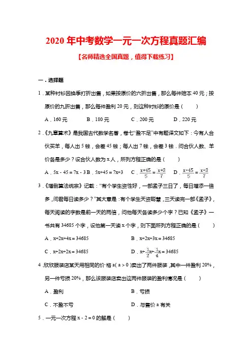 2020年中考数学一元一次方程真题汇编【名师精选全国真题,值得下载练习】一.选择题1.某种衬衫因换季打折出售,如果按原价的六折出售,那么每件赔本40元;按原价的九折出售,那么每件盈利20元,则这种衬衫的原价是()A.160元B.180元C.200元D.220元2.《九章算术》是我国古代数学名著,卷七“盈不足”中有题译文如下:今有人合伙买羊,每人出5钱,会差45钱;每人出7钱,会差3钱.问合伙人数、羊价各是多少?设合伙人数为x人,所列方程正确的是()A.5x﹣45=7x﹣3 B.5x+45=7x+3 C.=D.=3.《增删算法统宗》记载:“有个学生资性好,一部孟子三日了,每日增添一倍多,问君每日读多少?”其大意是:有个学生天资聪慧,三天读完一部《孟子》,每天阅读的字数是前一天的两倍,问他每天各读多少个字?已知《孟子》一书共有34685个字,设他第一天读x个字,则下面所列方程正确的是()A.x+2x+4x=34685 B.x+2x+3x=34685C.x+2x+2x=34685 D.x+x+x=346854.欣欣服装店某天用相同的价格a(a>0)卖出了两件服装,其中一件盈利20%,另一件亏损20%,那么该服装店卖出这两件服装的盈利情况是()A.盈利B.亏损C.不盈不亏D.与售价a有关5.一元一次方程x﹣2=0的解是()A.x=2 B.x=﹣2 C.x=0 D.x=16.已知九年级某班30位学生种树72棵,男生每人种3棵树,女生每人种2棵树,设男生有x人,则()A.2x+3(72﹣x)=30 B.3x+2(72﹣x)=30C.2x+3(30﹣x)=72 D.3x+2(30﹣x)=727.关于x的一元一次方程2x a﹣2+m=4的解为x=1,则a+m的值为()A.9 B.8 C.5 D.48.蚊香长度y(厘米)与燃烧时间t(小时)之间的函数表达式为y=105﹣10t.则蚊香燃烧的速度是()A.10厘米/小时B.105厘米/小时C.10.5厘米/小时D.不能确定9.已知关于x的一元一次方程2(x﹣1)+3a=3的解为4,则a的值是()A.﹣1 B.1 C.﹣2 D.﹣310.一商店以每件150元的价格卖出两件不同的商品,其中一件盈利25%,另一件亏损25%,则商店卖这两件商品总的盈亏情况是()A.亏损20元B.盈利30元C.亏损50元D.不盈不亏二.填空题11.代数式与代数式3﹣2x的和为4,则x=.12.《九章算术》是中国传统数学最重要的著作之一.书中记载:“今有人共买鸡,人出九,盈十一;人出六,不足十六.问人数几何?”意思是:“有若干人共同出钱买鸡,如果每人出九钱,那么多了十一钱;如果每人出六钱,那么少了十六钱.问:共有几个人?”设共有x个人共同出钱买鸡,根据题意,可列一元一次方程为.13.关于x的方程mx2m﹣1+(m﹣1)x﹣2=0如果是一元一次方程,则其解为.14.若关于x的方程3x﹣kx+2=0的解为2,则k的值为.15.某品牌旗舰店平日将某商品按进价提高40%后标价,在某次电商购物节中,为促销该商品,按标价8折销售,售价为2240元,则这种商品的进价是元.16.《九章算术》是我国古代内容极为丰富的数学名著,书中有如下问题:“今有善行者行一百步,不善行者行六十步.今不善行者先行一百步,善行者追之,问几何步及之?“其意思为:速度快的人走100步,速度慢的人只走60步,现速度慢的人先走100步,速度快的人去追赶,则速度快的人要走步才能追到速度慢的人.17.若m+1与﹣2互为相反数,则m的值为.18.小明按标价的八折购买了一双鞋,比按标价购买节省了40元,这双鞋的实际售价为元.19.古代名著《算学启蒙》中有一题:良马日行二百四十里.驽马日行一百五十里.驽马先行一十二日,问良马几何追及之.意思是:跑得快的马每天走240里,跑得慢的马每天走150里.慢马先走12天,快马几天可追上慢马?若设快马x天可追上慢马,则由题意,可列方程为.20.文具店销售某种笔袋,每个18元,小华去购买这种笔袋,结账时店员说:“如果你再多买一个就可以打九折,价钱比现在便宜36元”,小华说:“那就多买一个吧,谢谢,”根据两人的对话可知,小华结账时实际付款元.三.解答题21.“今有善行者行一百步,不善行者行六十步.”(出自《九章算术》)意思是:同样时间段内,走路快的人能走100步,走路慢的人只能走60步.假定两者步长相等,据此回答以下问题:(1)今不善行者先行一百步,善行者追之,不善行者再行六百步,问孰至于前,两者几何步隔之?即:走路慢的人先走100步,走路快的人开始追赶,当走路慢的人再走600步时,请问谁在前面,两人相隔多少步?(2)今不善行者先行两百步,善行者追之,问几何步及之?即:走路慢的人先走200步,请问走路快的人走多少步才能追上走路慢的人?22.为实施乡村振兴战略,解决某山区老百姓出行难的问题,当地政府决定修建一条高速公路.其中一段长为146米的山体隧道贯穿工程由甲乙两个工程队负责施工.甲工程队独立工作2天后,乙工程队加入,两工程队又联合工作了1天,这3天共掘进26米.已知甲工程队每天比乙工程队多掘进2米,按此速度完成这项隧道贯穿工程,甲乙两个工程队还需联合工作多少天?23.小李读一本名著,星期六读了36页,第二天读了剩余部分的,这两天共读了整本书的,这本名著共有多少页?24.学校准备添置一批课桌椅,原计划订购60套,每套100元,店方表示:如果多购,可以优惠.结果校方实际订购了72套,每套减价3元,但商店获得了同样多的利润.(1)求每套课桌椅的成本;(2)求商店获得的利润.25.“绿水青山就是金山银山”,海南省委省政府高度重视环境生态保护,截至2017年底,全省建立国家级、省级和市县级自然保护区共49个,其中国家级10个,省级比市县级多5个.问省级和市县级自然保护区各多少个?26.《孙子算经》中有这样一道题,原文如下:今有百鹿入城,家取一鹿,不尽,又三家共一鹿,适尽,问:城中家几何?大意:今有100头鹿进城,每家取一头鹿,没有取完,剩下的鹿每3家共取
