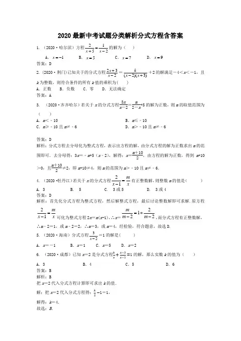 2020最新中考试题分类解析分式方程含答案1. (2020·哈尔滨)方程2152-=+x x 的解为( ) A .1-=xB .5=xC .7=xD .9=x答案:D 2. (2020·荆门)已知关于的分式方程232x x +-=(2)(3)k x x -++2的解满足-4<x <-1,且k 为整数,则符合条件的所有k 值的乘积为( )A .正数B .负数C .零D .无法确定答案:A3. (2020·齐齐哈尔)若关于x 的分式方程3x x -2=m 2-x+5的解为正数,则m 的取值范围为( )A .m <﹣10B .m ≤﹣10C .m ≥﹣10且m ≠﹣6D .m >﹣10且m ≠﹣6答案:D解析:分式方程去分母化为整式方程,表示出方程的解,由分式方程的解为正数求出m 的范围即可.去分母得:3x =﹣m +5(x ﹣2),解得:x =m +102,由方程的解为正数,得到m +10>0,且m +102≠2,即m +10≠4,则m 的范围为m >﹣10且m ≠﹣6.4. (2020·牡丹江)若关于x 的分式方程xm x =-12有正整数解,则整数m 的值是( ) A. 3 B. 5 C. 3或5 D. 3或4答案:D解析:首先化分式方程为整式方程,然后解整式方程,最后讨论整数解即可求解.原方程x m x =-12可化为整式方程2x =m (x -1),∴x =2212-+=-m m m ,而分式方程有正整数解,∴m ﹣2=1,或m ﹣2=2,∴m =3,或m =4,经检验,符合题意,故选D.5. (2020·海南)分式方程32x -=1的解是( ) A .x =-1 B .x =1 C .x =5D .x =2 6. (2020·成都)已知x =2是分式方程k x +x−3x−1=1的解,那么实数k 的值为( )A .3B .4C .5D .6答案:B解析:B把x =2代入分式方程计算即可求出k 的值.解:把x =2代入分式方程得:k 2−1=1,解得:k =4.故选:B .7. (2020·重庆A 卷)若关于x 的一元一次不等式组3132x x x a-⎧≤+⎪⎨⎪≤⎩的解集为x ≤a ;且关于y 的分式方程34122y a y y y --+=--有正整数解,则所有满足条件的整数a 的值之积是( ) A .7 B .-14 C .28 D .-56答案:A解析:A对于不等式组313,2x x x a -⎧≤+⎪⎨⎪≤⎩①②,解不等式①,得x ≤7.解不等式②,得x ≤a .因为不等式组的解集为x ≤a ,∴a ≤7.对于分式方程34122y a y y y --+=--,去分母,得y -a +3y -4=y -2,解这个整式方程,得y =+23a .因为a ≤7,所以当a =1,4,7时+23a 为正整数.当a =4时, y =2是分式方程的增根,分式方程无解.综上,可得a =1或7,它们的积为1×7=7.8. (2020·云南)若整数a 使关于x 的不等式组,有且只有45个整数解,且使关于y 的方程+=1的解为非正数,则a 的值为( )A .﹣61或﹣58B .﹣61或﹣59C .﹣60或﹣59D .﹣61或﹣60或﹣59 答案:B解析: B .本题考查了分式方程的解、解一元一次不等式组、一元一次不等式组的整数解,解不等式组,得<x ≤25,根据不等式组有且只有45个整数解,可得﹣61≤a <﹣58,根据关于y 的方程+=1的解为非正数:解得a ≥﹣61,又y +1不等于0,进而可得a 的值为:﹣61或﹣59.9. (2020·四川南充)若1=-4x,则x 的值是 ( ) A .4 B .41 C .41- D .﹣4 答案:C解析:C去分母得-4x =1,解得x =-14.因为x =-14≠0,则方程的解为x =-14.故选C . 10. (2020·甘孜州)分式方程x -31-1=0的解为( ) A .x =1 B .x =2 C .x =3 D .x = 411. (2020·上海)用换元法解方程x +1x 2+x 2x +1=2时,若设x +1x 2=y ,则原方程可化为关于y 的方程是( )A .y 2-2y +1=0B .y 2+2y +1=0C .y 2+y +2=0D .y 2+y -2=0答案:A 12. (2020·枣庄)对于实数a 、b ,定义一种新运算“⊗”为:21a b a b ⊗=-,这里等式右边是实数运算.例如:21113138⊗==--.则方程()2214⊗-=--x x 的解是( ) A .x =4 B .x =5 C .x =6 D .x =7答案:B解析:B 根据新定义运算,把方程转化为分式方程.因为211(2)(2)4x x x ⊗-==---,所以原方程可转化为12144x x =---,解得x =5.经检验,x =5是原方程的解. 13. (2020·重庆B 卷)若关于x 的一元一次不等式组()2x 13212x x a -≤-⎧⎪⎨->⎪⎩的解集为x ≥5,且 关于的y 分式方程+122y a y y=---有非负整数解,则符合条件的所有整数a 的和为( ) A .-1 B .-2 C .-3 D .0答案:B14. (2020·盐城) 分式方程10x x-=的解为x = . 15. (2020·徐州)方程981x x =-的解为 .答案:x=916. (2020·淮安)方程3101x +=-的解为_______________. 答案:x =﹣2 17. (2020·南京)方程1x x -=12x x -+的解是______.答案:x =18. (2020·潍坊)若关于x 的分式方程33122x m x x +=+--有增根,则m =_________.19. (2020·包头)分式方程3122x x x x -+=--的解是 . 答案:5320. (2020·广州)方程3122xx x 的解是 .解析:32x 21. (2020·菏泽)方程111-+=-x x x x 的解是______. 答案 x =31 22. (2020·苏州)解方程:2111x x x +=--. 解:方程两边同乘以1x -,得()12x x +-= 解这个一元一次方程,得32x =. 检验,当32x =时,分母不等于0,所以32x =是原方程的解.。
