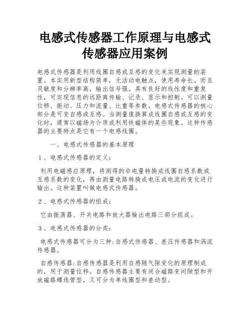 电感式传感器的基本原理及应用1. 什么是电感式传感器?电感式传感器是一种基于电感量的感应原理来测量、监测和控制各种物理量的装置。