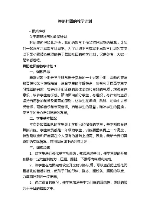 舞蹈社团的教学计划1一、训练目标舞蹈兴趣小组是学生非常乐于参与的一个兴趣小组,活动内容与教育性和艺术性相结合,适合学生的年龄特点,它有利于提高学生学习舞蹈的兴趣,培养孩子们正确的形体姿态和良好的气质,增强集体意识,培养学生的乐感。