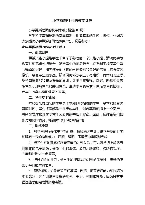 小学舞蹈社团活动计划6篇小学舞蹈社团活动计划1一、指导思想贯彻“为生命而教育”的思想,为学校培养舞蹈特长学生,使孩子们的个性特长得到发展。