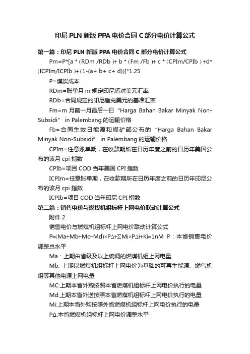 印尼PLN新版PPA电价合同C部分电价计算公式第一篇:印尼PLN新版PPA电价合同C部分电价计算公式Pm=P*[a * (RDm /RDb )+ b * (Fm /Fb )+ c * (CPIm/CPIb ) +d* (ICPIm/ICPIb )+ (1-(a+ b+ c+ d))]*1.25P=煤炭成本RDm=账单月m规定印尼盾对美元汇率RDb=合同规定的印尼盾兑美元的基准汇率Fm=m月前一月最后一日“Harga Bahan Bakar Minyak Non-Subsidi” in Palembang的运输价格Fb=合同生效日能源和煤矿部公布的“Harga Bahan Bakar Minyak Non-Subsidi” in Palembang的运输价格CPIm=任意账单期,在收款期所在日历年度之前的日历年美国公布的该月cpi指数CPIb=项目COD当年美国CPI指数ICPIm=任意账单期,在收款期所在日历年度之前的日历年印尼公布的该月cpi指数ICPIb=项目COD当年印尼CPI指数第二篇:销售电价与燃煤机组标杆上网电价联动计算公式附件2销售电价与燃煤机组标杆上网电价联动计算公式P=(Ma+Mb+Mc-Md)⨯P∆+∑Mi⨯P∆i+Ki=1nM P:本省销售电价调整总水平Ma:上期由省级及以上统调的燃煤机组上网电量Mb: 上期以燃煤机组标杆上网电价为基础的可再生能源、燃气机组等其他电源上网电量MC:上期本省外购按照本省燃煤机组标杆上网电价执行的电量Md:上期本省外送按照本省燃煤机组标杆上网电价执行的电量Mi:上期本省外购按照外省燃煤机组标杆上网电价执行的电量PΔ:本省燃煤机组标杆上网电价调整水平PΔi:外购电量来源省燃煤机组标杆上网电价调整水平M:上期省级电网销售电量K:统一电价政策影响因子。