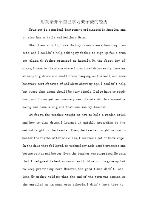 用英语介绍自己学习架子鼓的经历Drum set is a musical instrument originated in America,and it also has a title called Jazz Drum.When I was a child,I saw that my friends were learning drum sets,and I couldn't help asking my father to sign up for a drum set class.My father promised me happily.On the first day of class,I came to the place where I practiced drums early.Looking at many big drums and small drums hanging on the wall,and some honorary certificates of children about my age,I couldn't help but guess that drums should be very simple.I also have to study hard,and I can get an honorary certificate.At this moment,a young man came along,and that man was my teacher.At first,the teacher taught me how to hold a wooden stick and how to play drums.I learned it quickly according to the method taught by the teacher.Then,the teacher taught me how to master the rhythm.After one class,I learned a lot of knowledge. In the days that followed,my technology made rapid progress and became better and better.Even the teacher was surprised.He said that I had great talent in music and told me not to give up,but to keep practicing hard.However,the good times didn't last long.My mother told me that the end of the term was coming,so she enrolled me in many cram schools.I didn't have time topractice drums.So,slowly,I didn't practice the drum set any more.On the road of growing up,learning the drum set is only a short period of time in my life,but it is the most wonderful part of my life.If God can let me practice the drum set again,I will definitely practice it well.架子鼓是一种源于美国的乐器,它还有一个称号叫爵士鼓。