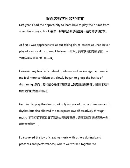 跟着老师学打鼓的作文Last year, I had the opportunity to learn how to play the drums from a teacher at my school. 去年,我有机会跟学校里的一位老师学习打鼓。