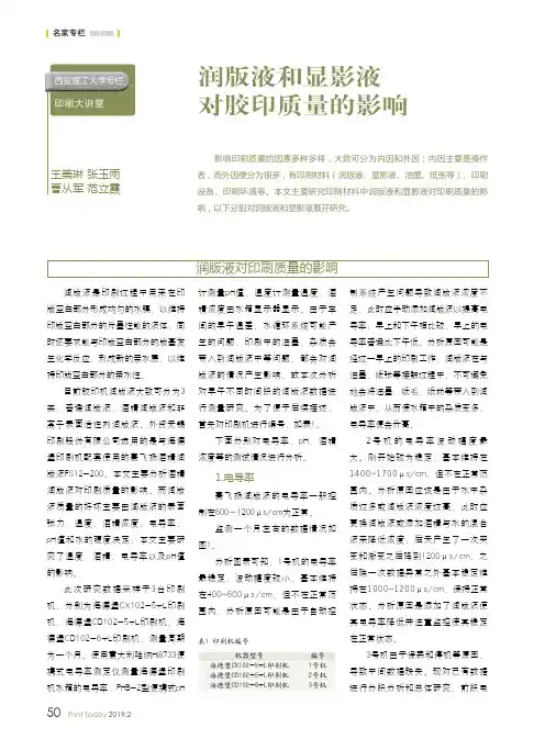 名家专栏COLUMN润版液和显影液 对胶印质量的影响润版液对印刷质量的影响表1 印刷机编号影响印刷质量的因素多种多样,大致可分为内因和外因;内因主要是操作者,而外因便分为很多,有印刷材料(润版液、显影液、油墨、纸张等)、印刷设备、印刷环境等。