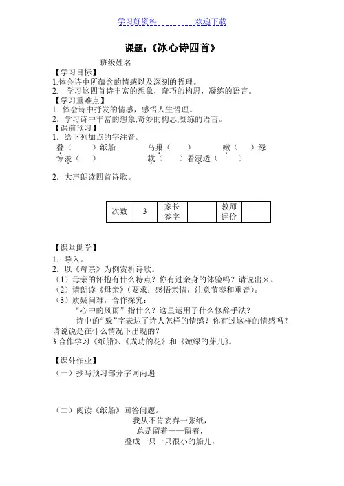 《冰心诗四首》教案优秀3篇《冰心诗四首》教案篇一《冰心诗四首》教学设计教学目标:学习《母亲》《纸船》,体味人间至爱真情。