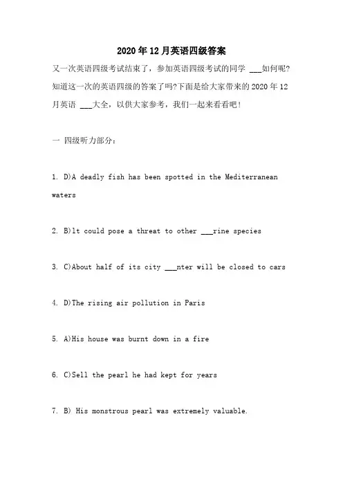2020年12月英语四级真题及参考答案(完整版)Part I writingDirections:For this part,you are allowed30minutes to write a composition on the topic “Changes in the way of Transportation”.You should write at least120words but no more than180words.参考范文:With the social and economic development,our means of transportation have changed a lot over the last few decades,which has brought much convenience to our life.In the1970s and1980s,bicycles were the primary means of public transportation.Families that owned a bicycle were thought to be in relatively good economic conditions.Because of the implementation of the reform and opening policy,the economy and people’s living standards were improved a lot and travelling by private cars became more and more common in1990s and2000s. And thanks to the information technology,we can now enjoy bike-sharing service and online ride-hailing service which help to make our journey more economical and flexible.We have enough reason to believe that our way of transportation could be more and more economically friendly and intelligent.Part II Listening ComprehensionPartⅡListening Comprehension(25minutes)Section ADirections:In this section,you will hear three news reports.At the end of each news report,you will hear two or three questions.Both the news report and the questions will be spoken only once.After you hear a question.you must choose the best answer from the four choices marked A),B).C)and D).Then mark the corresponding letter on Answer Sheet1with a single line through she centre. Questions1and2are based on the news report you have just heard.1.A)A deadly fish has been spotted in the Mediterranean waters.B)Invasive species are driving away certain native species.C)The Mediterranean is a natural habitat of Devil Firefish.D)Many people have been attacked by Devil Firefish.2.A)It could add to greenhouse emissions.B)It could disrupt the food chains there.C)It could pose a threat to other marine species.D)It could badly pollute the surrounding waters.C)Spend a few nights on a small island.D)Sell the pearl he had kept for years.Questions3and4are based on the news report you have just heard.3.A)cars will not be allowed to enter the city.B)About half of its city center will be closed to cars.C)Buses will be the only vehicles allowed on its streets.D)Pedestrians will have free access to the city.4.A)The rising air pollution in Paris.B)The worsening global warming.C The ever-growing cost of petrol.D)The unbearable traffic noise.Questions5to7are based on the news report you have just heard.5.A)Many of his possessions were stolen.B)His house was burnt down in a fire.C)His fishing boat got wrecked on a rock.D)His good luck charm sank into the sea.6.A)Change his fishing locations.B)Find a job in a travel agency.C))Spend a few nights on a small islandD)Sell the pearl he had kept for years7.A)A New Year museumB)The largest pearl in the world weighsC)His monstrous pearl was extremely valuable.D)His pearl could be displayed in a museum.Section BDirections:In this section,you will hear two long conversations.At the end of each conversation, you will hear four questions.Both the conversation and the questions will be spoken only once.After you hear a question,you must choose the best answer from the four choices marked A),B),C and D). Then mark the corresponding letter on Answer Sheet1with a single line through the centre. Questions8to11are based on the conversation you have just heard.8.A)It boasts a fairly long history.B)It produces construction materials.C)It has75offices around the world.D)It has over50business partners.9.A)It has about50employees.B)It was started by his father.C)It has a family business.D)It is over100years old.10.A)Shortage of raw material supply.B)Legal disputes in many countries.C)Outdated product design.D)Loss of competitive edge.11.A)Conducting a financial analysis for it.B)Providing training for its staff members.C)Seeking new ways to increase is exports.D)Introducing innovative marketing strategies.Questions12to15are based on the conversation you have just heard.12.A)She is a real expert at house decorations.B)She is well informed about the design business.C)She is attracted by the color of the sitting room.D)She is really impressed by the man’s house.13.A)From his younger brother Greg.B)From home design magazines.C)From a construction businessman.D)From a professional interior designer.14.A)The effort was worthwhile.B)The style was fashionable.C)The cost was affordable.D)The eft was unexpected.15.A)She’d like him to talk with Jonathan about a new project.B)She wants him to share his renovation experience with herC)She wants to discuss the house decoration budget with him.D)She’d like to show him around her newly-renovated house.Section CDirections:In this section,you will hear three passages.At the end of each passage,you will hear three or four questions.Both the passage and the questions will be spoken only once.After you hear a question,you must choose the best answer from the your choices marked A),B),C)and D).Then mark he corresponding letter on Answer Sheet1with a single line through the centre. Questions16to18are based on the passage you have just heard.16.A)Providing routine care for small children.B)Paying hospital bills for emergency cases.C)Doing research on ear,nose and throat diseases.D)Removing objects from patients’noses and ears.17.A)Many children like to smell things they find or play with.B)Many children like to put foreign objects in their mouths.C)Five-to nine-year-olds are the mos likely to put things in their ears.D)Children aged one to four a often more curious than older children.18.A)They tend to act out of impulse.B)They want to attract attentions.C)They are unaware of the potential risks.D)They are curious about these body parts.Questions19to21are based on the passage you have just heard.19.A)It paid for her English lessons.B)It gave her a used bicycle.C)It delivered her daily necessitie