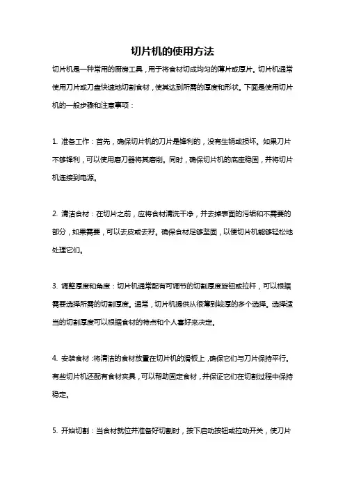 切片机的使用方法切片机是一种常用的厨房工具,用于将食材切成均匀的薄片或厚片。