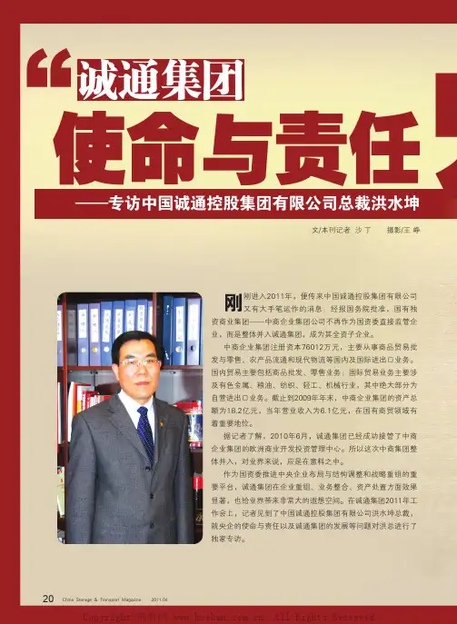 诚通集团使命与责任——专访中国诚通控股集团有限公司总裁洪水坤文/本刊记者 沙 丁 摄影/王 峥访谈诚通集团:使命与责任访谈NTERVIEWI记者:洪总您好!诚通集团作为国务院国资委确定的国有资产经营公司试点企业,发展势头迅猛,社会各界对诚通集团也一直给予高度关注。