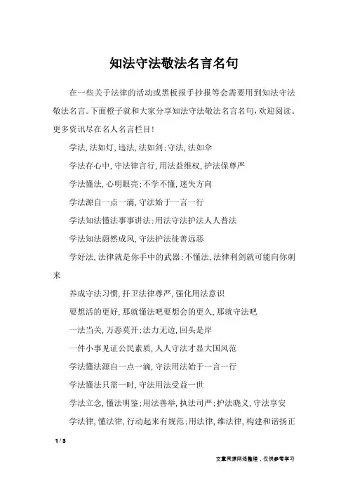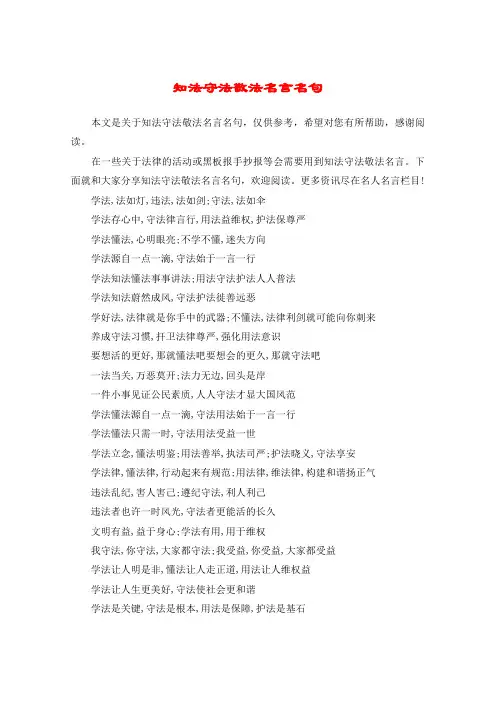 更多资讯尽在名人名言栏目!学法,法如灯,违法,法如剑;守法,法如伞学法存心中,守法律言行,用法益维权,护法保尊严学法懂法,心明眼亮;不学不懂,迷失方向学法源自一点一滴,守法始于一言一行学法知法懂法事事讲法;用法守法护法人人普法学法知法蔚然成风,守法护法徙善远恶学好法,法律就是你手中的武器;不懂法,法律利剑就可能向你刺来养成守法习惯,扞卫法律尊严,强化用法意识要想活的更好,那就懂法吧要想会的更久,那就守法吧一法当关,万恶莫开;法力无边,回头是岸一件小事见证公民素质,人人守法才显大国风范学法懂法源自一点一滴,守法用法始于一言一行学法懂法只需一时,守法用法受益一世学法立念,懂法明鉴;用法善举,执法司严;护法晓义,守法享安学法律,懂法律,行动起来有规范;用法律,维法律,构建和谐扬正1 / 3气违法乱纪,害人害己;遵纪守法,利人利己违法者也许一时风光,守法者更能活的长久文明有益,益于身心;学法有用,用于维权我守法,你守法,大家都守法;我受益,你受益,大家都受益学法让人明是非,懂法让人走正道,用法让人维权益学法让人生更美好,守法使社会更和谐学法是关键,守法是根本,用法是保障,护法是基石学法是和谐的源头,守法是平安的根本学法是人生的指明灯,守法是公民的护身符学法以明理,知法以立德,守法以校行,用法以维权,护法以强国学法以正,普法以诚,明法以精,尚法以恒学法用法,公民从自身做起;立法执法,公仆要依法办事学法用法人人依法维权,爱法护法共建和谐家园无法无天,害人害己;遵纪守法,幸福你我小偷小偷何其多,防范意识要先行;小偷小偷真可恶,法律严打势必行学法,是人生的必修课;用法,是平安的护身符学法,知法,守法,护法;为你,为我,为他,为大家学法,知可为与不可为;用法,行应为而勿妄为学法用法守法护法,努力提高全民法律素质2 / 3学法辨是非,懂法正言行,知法明荣辱,用法处纷争,守法创和谐学法辨是非,用法处纷争,守法正言行,护法创和谐学法辨是非,知法明荣辱,懂法正言行,守法创和谐学法辨是非,知法明荣辱,用法处纷争,争做守法好公民学法辩是非,懂法正言行,用法解纷争心存正义走遍天下,目中无法寸步难行心似明镜,拂尘去垢镜自清;法如活水,正本清源水长流心头常亮法律红绿灯,脚下永走平安幸福路心中有法,海阔任你飞;心中无法,寸步艰难行心中有品,言行文明;胸中有法,幸福安宁心中尊法,自主学法,诚信守法,办事依法,和谐有法胸怀公德,言行文明;心存法纪,幸福一生学(懂)法走遍天下,法盲寸步难行学法明是非,守法明荣辱,依法处纷争,用法促发展学法明是非,守法明荣辱,用法促发展学法暖如微微春风,守法甜似汩汩清泉学法与维权息息相关,守法与和谐时时相伴3 / 3。