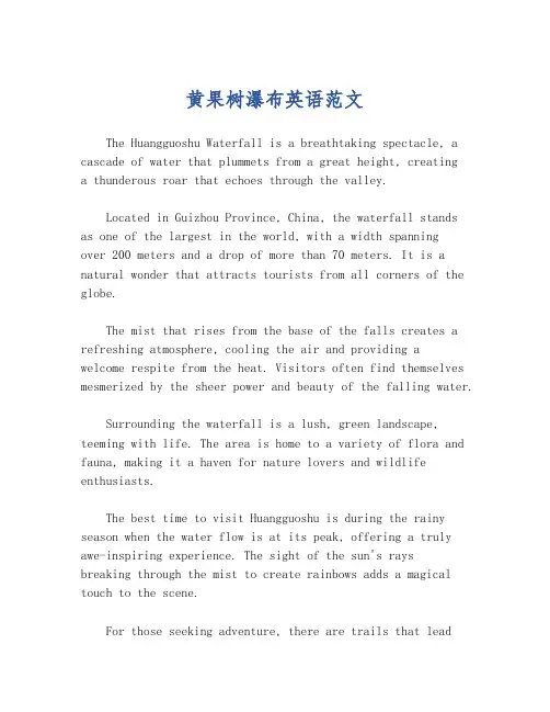 英文介绍黄果树瀑布作文Huangguoshu Waterfall is a magnificent natural wonder located in Guizhou Province, China. It is one of thelargest and most famous waterfalls in Asia. The waterfall is characterized by its immense size and powerful flow, making it a popular tourist attraction.Standing in front of Huangguoshu Waterfall, you canfeel the mist on your face and hear the thunderous roar of the water. The sight is truly awe-inspiring. The waterfall cascades down from a height of 77.8 meters, creating a breathtaking spectacle. The water crashes onto the rocks below, creating a beautiful spray of water droplets that sparkle in the sunlight.The surrounding landscape is equally stunning. The waterfall is nestled in a lush, green forest, adding to its natural beauty. The sound of birds chirping and leaves rustling in the wind creates a peaceful and serene atmosphere. It is a place where you can escape the hustleand bustle of city life and immerse yourself in nature.Visiting Huangguoshu Waterfall is not just about admiring its beauty, but also about experiencing the thrill of getting up close to the cascading water. There are various viewing platforms and walkways that allow visitors to explore the waterfall from different angles. You can even take a boat ride to get a closer look at the waterfall and feel the mist on your skin. It is a truly immersive experience that will leave you in awe.Apart from its natural beauty, Huangguoshu Waterfall also has cultural significance. It has been a source of inspiration for poets and artists throughout history. Its grandeur and power have been depicted in numerous works of art, capturing the essence of this majestic waterfall.In conclusion, Huangguoshu Waterfall is a must-visit destination for nature lovers and adventure seekers. Its immense size, powerful flow, and stunning surroundings make it a sight to behold. Whether you are looking for a peaceful retreat or an adrenaline-pumping adventure,Huangguoshu Waterfall has something to offer for everyone. So, pack your bags and get ready to be amazed by the beauty of this natural wonder.。