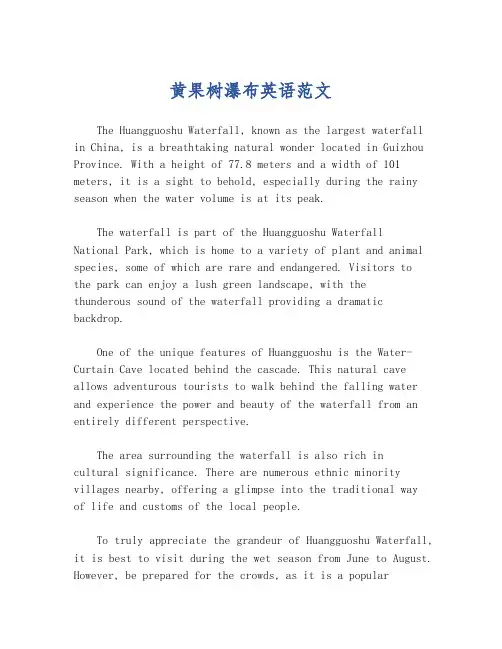 黄果树瀑布英语范文The Huangguoshu Waterfall, known as the largest waterfall in China, is a breathtaking natural wonder located in Guizhou Province. With a height of 77.8 meters and a width of 101 meters, it is a sight to behold, especially during the rainy season when the water volume is at its peak.The waterfall is part of the Huangguoshu WaterfallNational Park, which is home to a variety of plant and animal species, some of which are rare and endangered. Visitors tothe park can enjoy a lush green landscape, with thethunderous sound of the waterfall providing a dramatic backdrop.One of the unique features of Huangguoshu is the Water-Curtain Cave located behind the cascade. This natural cave allows adventurous tourists to walk behind the falling water and experience the power and beauty of the waterfall from an entirely different perspective.The area surrounding the waterfall is also rich incultural significance. There are numerous ethnic minority villages nearby, offering a glimpse into the traditional wayof life and customs of the local people.To truly appreciate the grandeur of Huangguoshu Waterfall, it is best to visit during the wet season from June to August. However, be prepared for the crowds, as it is a populardestination for both domestic and international tourists.In conclusion, the Huangguoshu Waterfall is a must-see for anyone interested in the natural beauty of China. Its majestic presence, combined with the surrounding natural and cultural attractions, makes it a destination that should not be missed.。