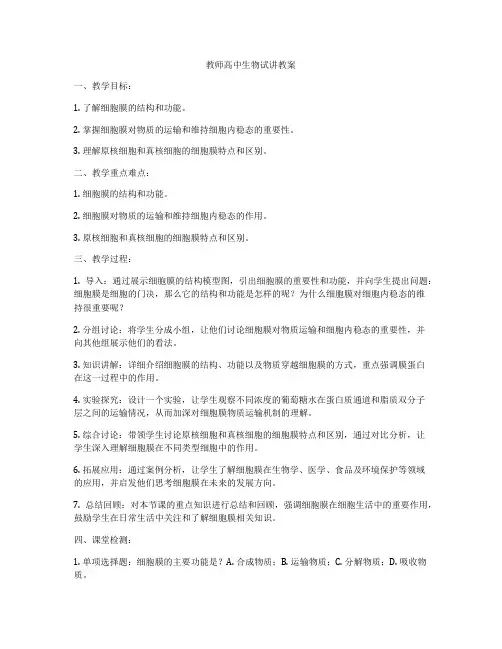 教师高中生物试讲教案一、教学目标:1. 了解细胞膜的结构和功能。
