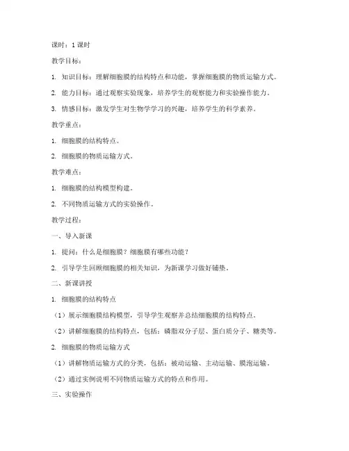 四、教学过程:(一)导入1. 提问:同学们,你们知道细胞膜是什么吗?它在细胞中有什么作用?2. 引导学生回顾细胞膜的相关知识,为新课的讲解做好铺垫。