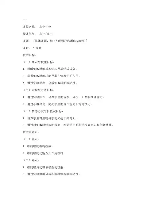 一、课题:《细胞膜的结构与功能》二、教学目标:1. 知识目标:(1)了解细胞膜的基本结构;(2)掌握细胞膜的功能;(3)理解细胞膜与细胞内外物质交换的关系。