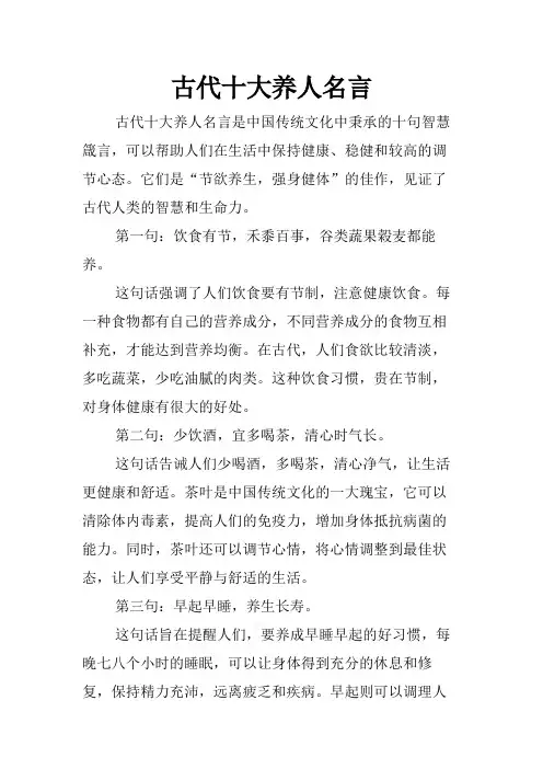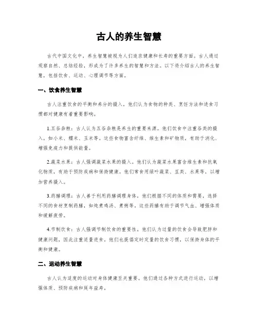 一、饮食养生智慧1. 饮食调理:古人认为饮食是养生的基础,注重饮食的平衡和调理。