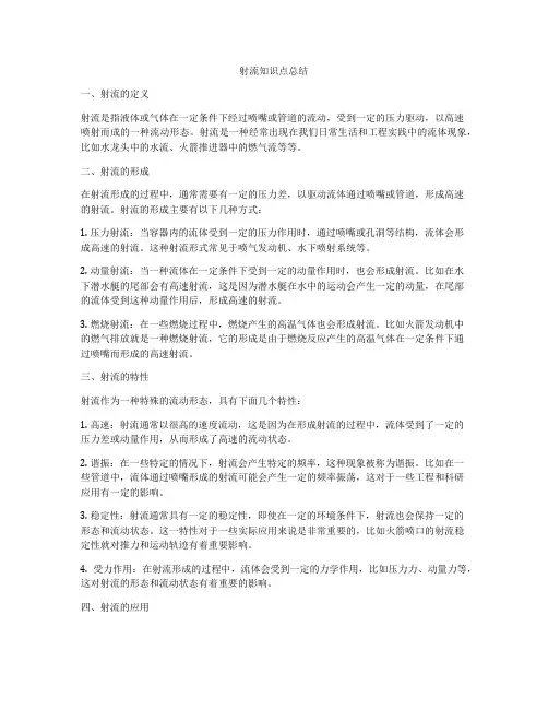 射流知识点总结一、射流的定义射流是指液体或气体在一定条件下经过喷嘴或管道的流动,受到一定的压力驱动,以高速喷射而成的一种流动形态。