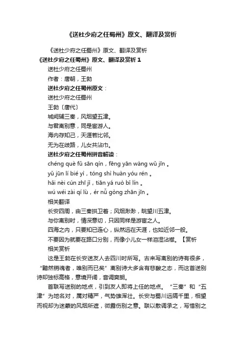 《送杜少府之任蜀州》原文及翻译赏析《送杜少府之任蜀州》原文及翻译赏析《送杜少府之任蜀州》原文及翻译赏析1送杜少府之任蜀州⑴城阙辅三秦⑵,风烟望五津⑶。