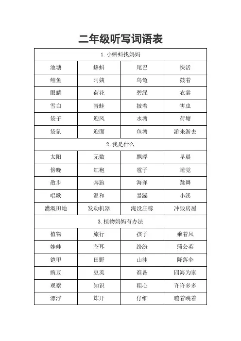 二年级下册听写词语姓名:1.脱掉解冻溪水棉花探出摇头摇动野外田野躲雨躲开解冻解脱解开2.未来追赶追问粉店商店干枯徐徐光荣青菜宿舍住宿烧火3.山冈世界轰走笋芽发芽呼唤4.表弟哥哥抽出拐弯浇水浇花终于安静清净躺下感谢渐渐微风微笑花骨朵5.瓦片温泉天然结巴结果一股清脆脆弱灯塔泉水杜鹃6.冒险雷锋需要年迈迷路足迹叔叔汗滴洒水洒落泥泞泥沙7.扑打托起抚摸锋利铃声脆弱周末芬芳夏天夏季应该应当9.小岛海岛展现建筑轻纱环绕围绕胜利隐约节省茂盛茂密盛开胜古迹引人入胜太阳高照群山环绕风光秀丽树木茂盛湖水碧隐隐约约点点灯光蒙蒙细雨开展10.秋季留着留步杏树杏花茂密蜜桃山坡搭起密切采摘山沟足够摘下钉钉子钉扣子11.龙舟恩情长寿柏树泼水泼洒活泼特别特产敬爱鲜花鲜艳脚印脚跟温度风度凤凰12.光束勾画单元简单夺取故宫打扮王府雄伟雄壮灯火辉煌闪烁伟大辉映灯光闪烁银光闪闪光彩夺目13.另外志向问题提出提高漫画漫长晴朗哄骗喝水朗读14.小刀要求仍然使用使唤方便邮票整齐正式而且英雄英语方式15.仙丹乌云艺术明显显然忽然丝巾旗杆眨眼波涛陈列转动斜线斜阳17.包含窗户窗外东吴火炉山岭鸣叫绝句停泊烟火流汗流浪柳树银河18.垂下垂直乱摆忙乱沉默沉重逃走阵雨蜘蛛蝉鸣彩虹彩旗一阵风蛛丝马迹越来越亮19.一册岩石宝贵趴下脚印埋没陆地钢铁地质质量厚度海底刨根问底20.忠实向导积雪碰见稀疏针线碰面慌张稀稠积少成多一盏灯21兄弟惊呆商场涂抹拥挤拱手决定坚决价钱花钱购买采购批评好评评选批语物价商量22答应玻璃拾取收拾破碎破坏粉碎滑雪继续傲慢骄傲陆续继续信封23拎水水桶停止停留聪明胳膊晃荡沉甸甸飘荡25 玲珑花狗糟糕楼梯肯定脑筋。