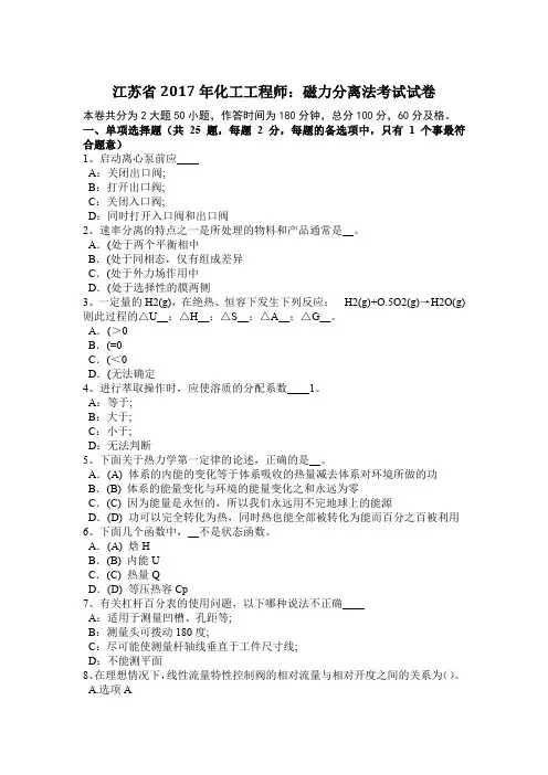 江苏省2017年化工工程师:磁力分离法考试试卷本卷共分为2大题50小题,作答时间为180分钟,总分100分,60分及格。
