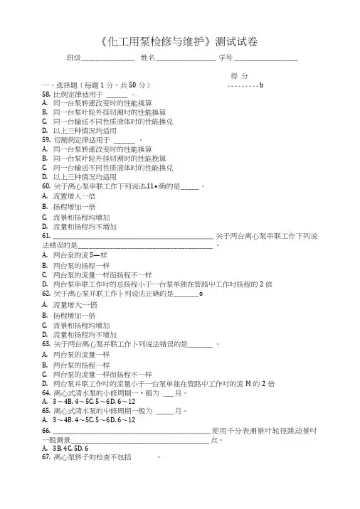 《化工用泵检修与维护》测试试卷班级_______________ 姓名_________________ 学号__________________得分一、选择题(每题1分,共50分)--------- b58.比例定律适用于 ______ 。
