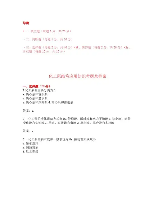 导读•一、填空题(每题1分,共20分)・二、判断题(每题1分,共10分)・三、选择题(每题2分,共40分)•四、简答题(每题2分,共20分)•五、开放题(每题10分,共10分)化工泵维修应用知识考题及答案一、选择题(20分)1化工泵的主要分类为Oa.离心泵和容积泵b.离心泵和潜水泵c.离心泵和深井泵d.离心泵和推进泵答案:a2.化工泵的液体流动方式有Oa.管道流、瞬时流和水力平衡流b.稳定流、流量变化流和失速流c.层流、过渡流和紊流d.单相流、混合流和多相流答案:c3.化工泵的轴承故障一般表现为Oa.振动增大或减小b.轴承温升c.漏油现象d.以上都是4.化工泵的机械密封的主要零件有Oa.弹簧、密封环、端盖和螺母b.泵轴、密封环、外壳和接头c.泵轴、端盖、止推环和O形圈d.弹簧、止推环、端盖和螺母答案:a5.化工泵的轴承寿命与以下哪个因素没有关系?a.轴承内径b.轴承外径c.轴承转速d.轴承螺母的松紧程度答案:d6.化工泵的轴承故障包括Oa.疲劳断裂、烧死、锈蚀和腐蚀b.断裂、锈蚀、磨损和失效c.过载、高温、磨损和润滑不良d.以上都是答案:d7.化工泵被泵介质侵蚀导致泵失效的类型为Oa.涡轮腐蚀b.气蚀c.颗粒磨损d.腐蚀磨损答案:d8.当化工泵运行时,若存在较大噪声,则可能由以下原因导致()a.叶轮损坏b.轴承松动c.进口流量过大或过小d.以上都是答案:d9.化工泵的运行过程中,若出现了水的渗漏,则通常是由O导致的。