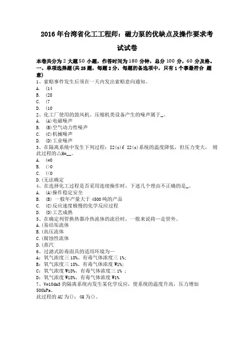 2016年台湾省化工工程师:磁力泵的优缺点及操作要求考试试卷本卷共分为2大题50小题,作答时间为180分钟,总分100分,60分及格。