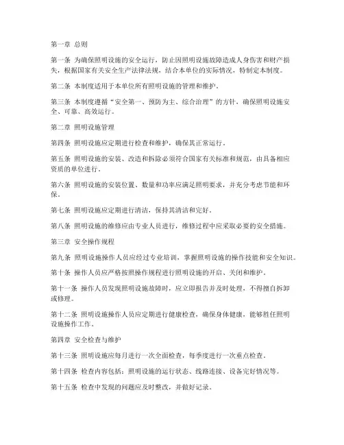 第一章总则第一条为确保照明设施的安全运行,防止因照明设施故障造成人身伤害和财产损失,根据国家有关安全生产法律法规,结合本单位的实际情况,特制定本制度。