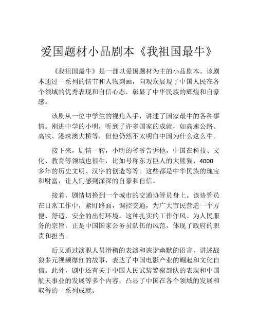 爱国题材小品剧本《我祖国最牛》《我祖国最牛》是一部以爱国题材为主的小品剧本。