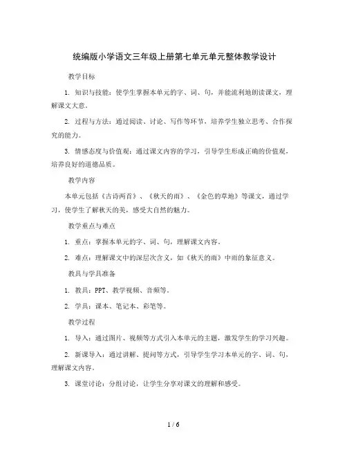 三年级上册语文书第七单元三年级上册语文书第七单元教案一、教学目标1.知识与技能:掌握本单元的生字词,理解课文内容,培养学生的阅读能力和表达能力。