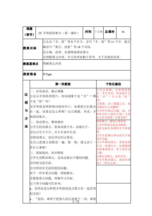 五、教学方法1. 教师讲解法:通过教师的讲解,引导学生理解课文的内容和含义;2. 讨论法:组织学生分组讨论课文中的问题和主题,激发学生思考和表达;3. 阅读理解训练法:通过阅读理解练,提高学生阅读和理解能力;4. 创作法:组织学生进行写作概括,培养他们的写作能力。