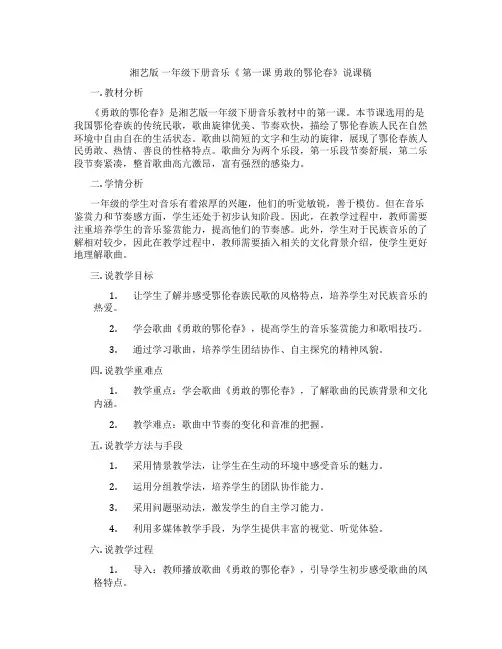一年级下册音乐说课稿(简谱)(歌表演)《勇敢的鄂伦春(2)》湘艺版一. 教材分析《勇敢的鄂伦春(2)》是湘艺版一年级下册音乐教材中的一首歌曲。