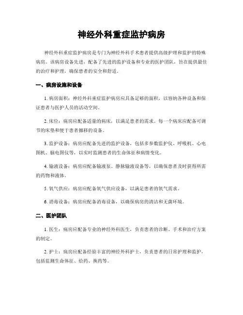 四、病房服务1. 监护和治疗:神经外科重症监护病房提供24小时全天候的监护和治疗服务,确保患者的生命体征稳定和病情得到及时控制。