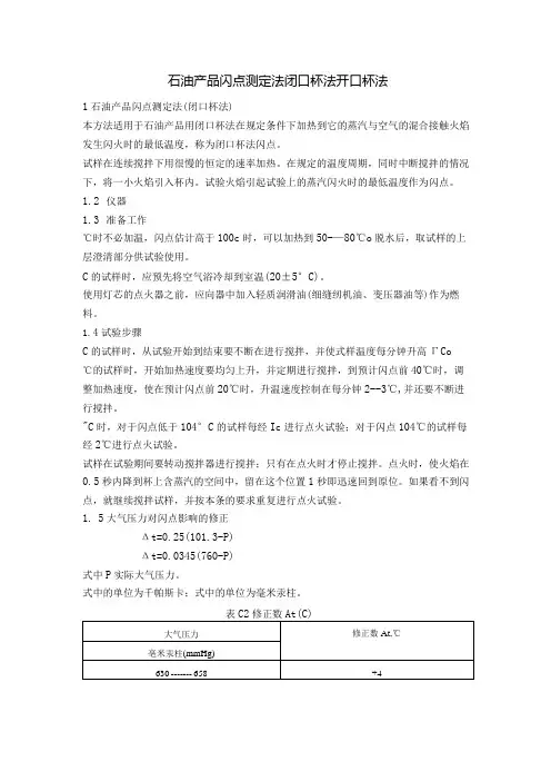 2.闪点的测定原理由于使用石油产品时有封闭状态和暴露状态的区别,测定闪点的方法有闭口杯法和开口杯法两种。