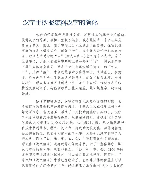 汉字手抄报资料汉字的简化古代的汉字属于表意性文字,字形结构的标音表义倾向,使得汉字的笔画、结构日益复杂起来,或者是因为一个字从单义变成了多义,因此,出于字形上分化区别意义的需要,往往也在原有的汉字上增添成分。