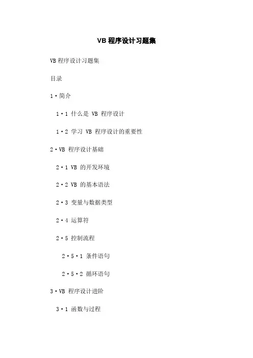 vb程序设计题库及答案详解在编写VB程序设计题库及答案详解时,我们通常会按照以下结构进行排版:1. 题目编号:为每个题目分配一个唯一的编号,方便索引和查找。