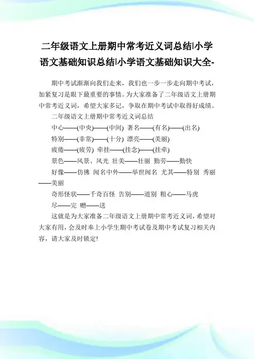二年级语文上册期中常考近义词总结中心——(中央)——(中间) 著名——(有名)——(出名)特别——(非常)——(十分) 漂亮——(美丽)疲倦——(疲劳) 牵挂——(挂念)——(挂牵)景色——风景、风光壮美——壮丽勤劳——勤快好像——仿佛闻名中外——举世闻名尤其——特别秀丽——美丽奇形怪状——千奇百怪告别——道别粗心——马虎尽——完赠——送这就是为大家准备二年级语文上册期中常考近义词,希望对大家有用,会及时奉上小学生期中考试卷及期中考试复习相关内容,请大家及时锁定!二年级语文上学期教学工作总结教学工作总结是对教学过程进行分析研究,找到不足的地方便于我们改正缺点,以此来提升自己的教学质量和教学效率。