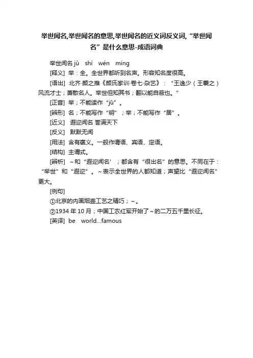 关于举世闻名成语的近义词有那些呢?如何使用举世闻名词语组词呢?小编给大家收集了关于举世闻名词语怎么组词,希望能帮助大家,欢迎大家学习参考!举世闻名成语【近义词】闻名遐迩、誉满天下、众人皆知【词语解释】jǔ shì wén míng举世闻名(舉世聞名)举世闻名jǔshì-wénmíng[of world renown] 全世界都知道,声名远播中国的象牙雕刻是杰出的, 北京的山水人物和广州的花卉动物牙雕,尤其举世闻名。