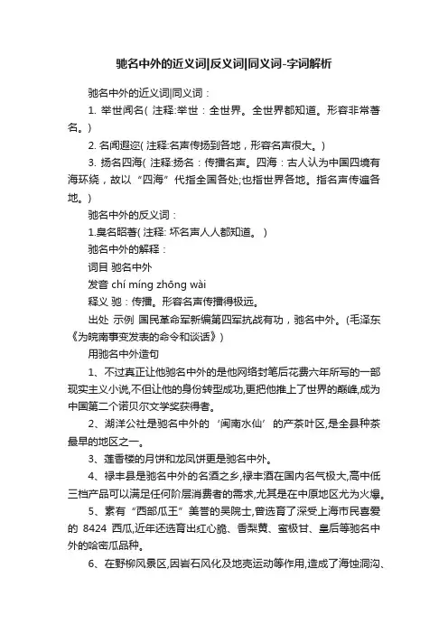 7、周举世闻名近义词篇二:闻名的近义词【近义词】:出名、有名、着名、知名、著名、驰名、1、开封是一座远近闻名的古城,一走进开封市便感觉到了一种古香古色的气息。