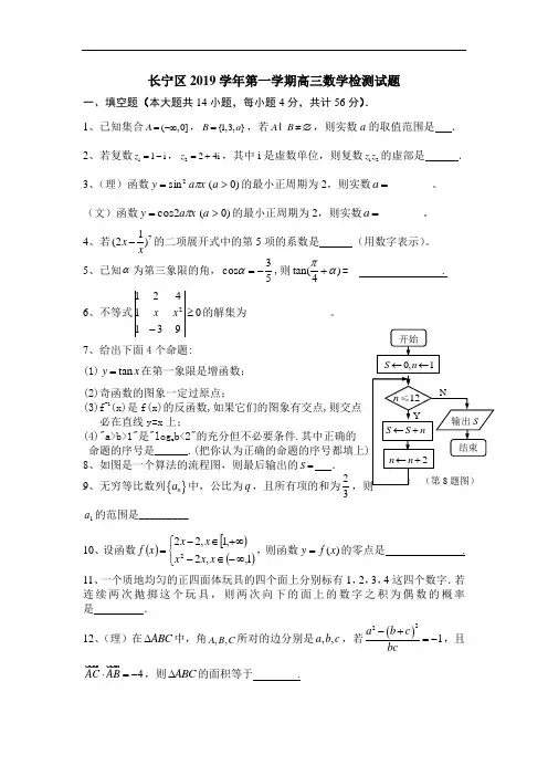 长宁区2019学年第一学期高三数学检测试题一、填空题(本大题共14小题,每小题4分,共计56分).1、已知集合(,0]A =-∞,{1,3,}B a =,若A B ≠∅,则实数a 的取值范围是 .2、若复数11i z =-,224i z =+,其中i 是虚数单位,则复数12z z 的虚部是 .3、(理)函数x a y π2sin =)0(>a 的最小正周期为2,则实数_______=a 。