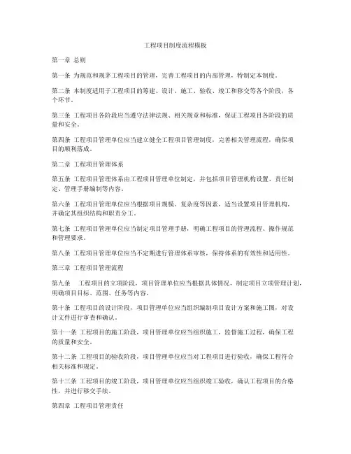 工程业务流程制度范文第一章总则第一条为规范我公司工程项目管理,并提高工程项目管理效率,保证工程项目进度和质量,制定本流程制度。