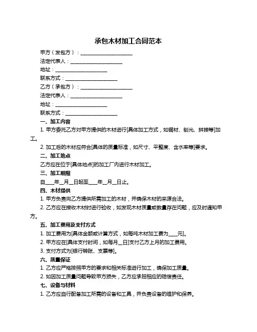 合同编号:_______甲方(发包方):________法定代表人:________地址:________乙方(承包方):________身份证号码:________地址:________鉴于甲方拥有一定的木材加工设施和原材料,需要乙方提供劳务进行木材加工,双方经友好协商,达成如下协议:一、合同标的1. 甲方将位于________的木材加工厂承包给乙方进行加工。
