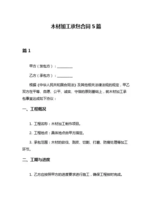 木材加工承包合同5篇篇1甲方(发包方):__________乙方(承包方):__________根据《中华人民共和国合同法》及其他相关法律法规的规定,甲乙双方在平等、自愿、公平、诚实、守信的原则基础上,就木材加工承包事宜达成如下协议:一、工程概况1. 工程名称:木材加工制作项目。