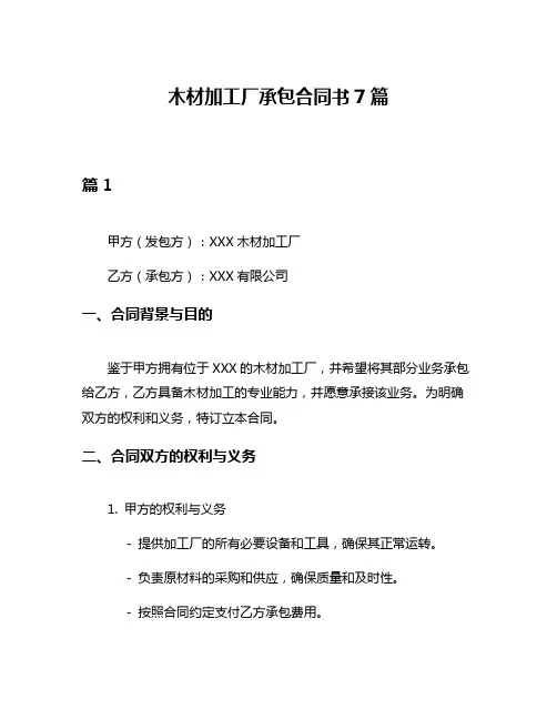 木材加工厂承包合同书7篇篇1甲方(发包方):XXX木材加工厂乙方(承包方):XXX有限公司一、合同背景与目的鉴于甲方拥有位于XXX的木材加工厂,并希望将其部分业务承包给乙方,乙方具备木材加工的专业能力,并愿意承接该业务。